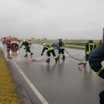 Zusammen mit der zusätzlich alarmierten Feuerwehr Schambach wurde die Einsatzstelle abgesichert und die Fahrbahn mit Besen, Schaufeln und Wasser gereinigt.